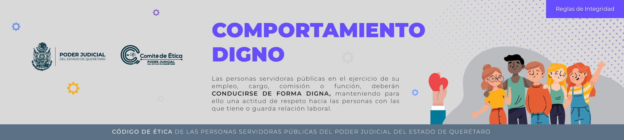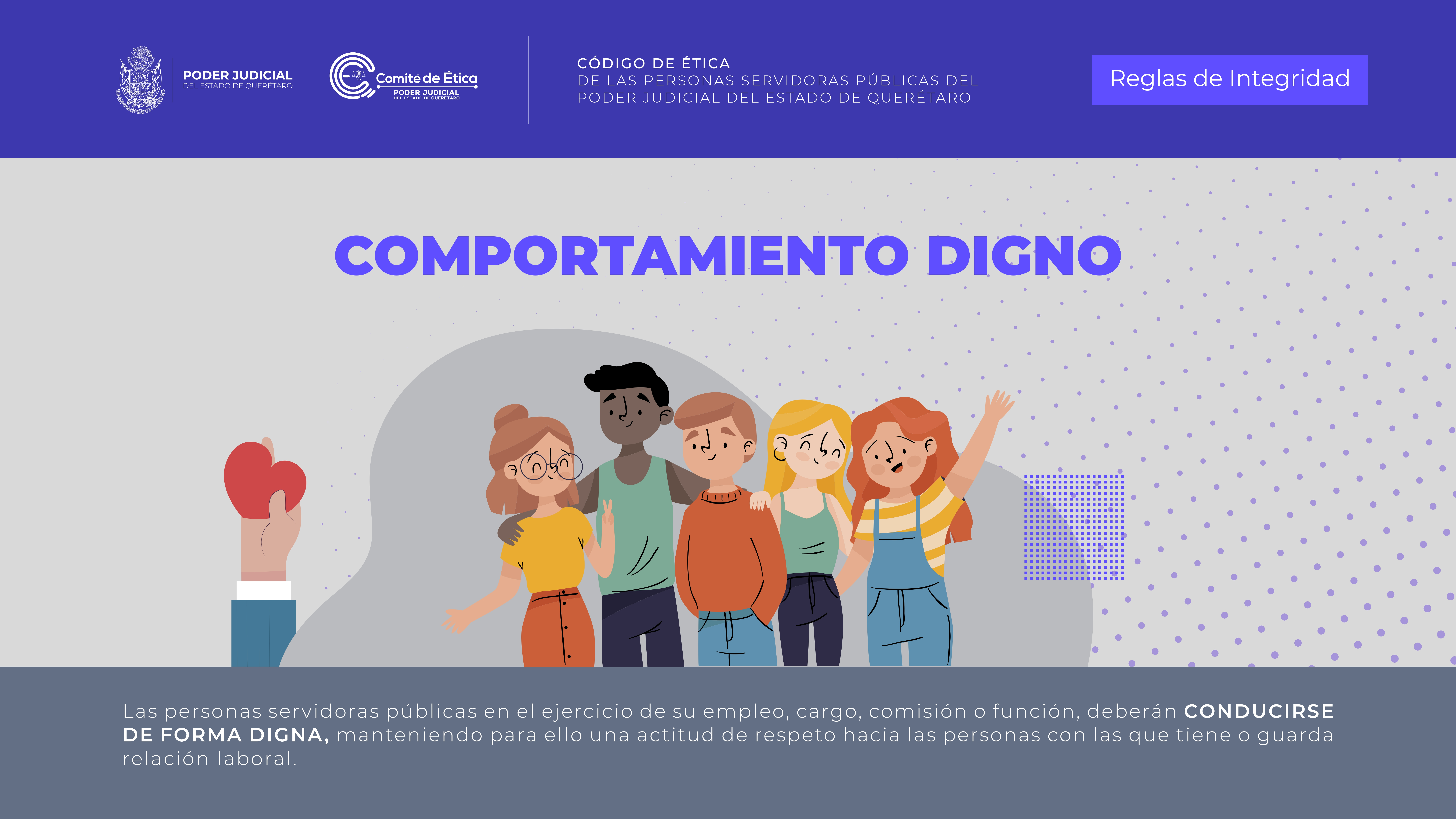Aprobada por el Comité de Ética, en la sesión ordinaria del 29 de enero de 2025, para dar a conocer mediante infografías mensuales las 12 reglas de integridad que contiene el Código de Ética de las Personas Servidoras Públicas del Poder Judicial del Estado de Querétaro; mismas que se difunden de la siguiente manera: