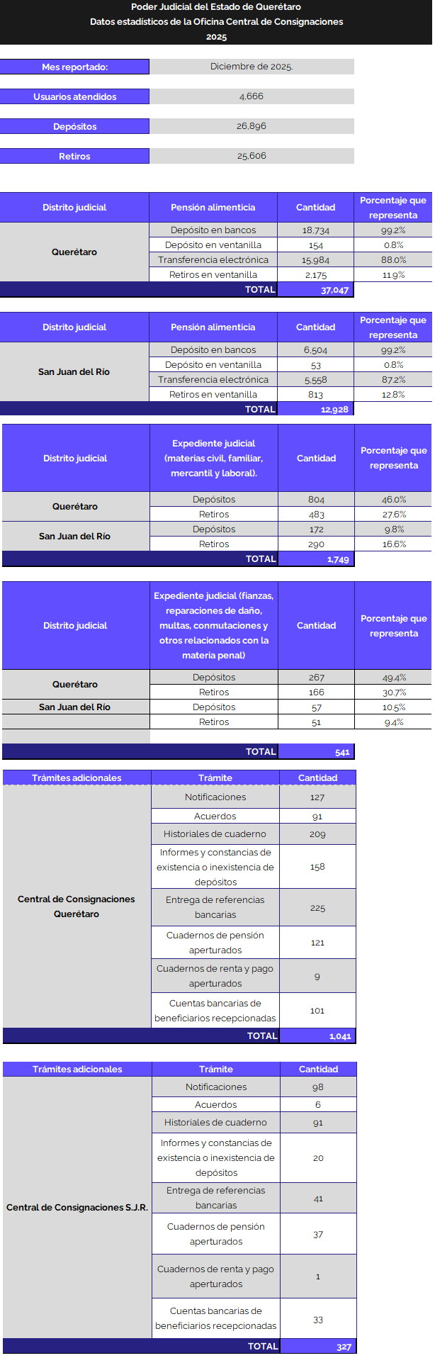 Una vez que se ha efectuado el primer depósito y la apertura de cuaderno, se le proporciona al depositante o pagador (referencia, número de convenio y cuenta clabe) para que los siguientes pagos los realice directo a la cuenta de BBVA del Poder Judicial del Estado de Querétaro, a través de pago en practicaja-cajeros automáticos y banca móvil o bien, por transferencia interbancaria (spei).
