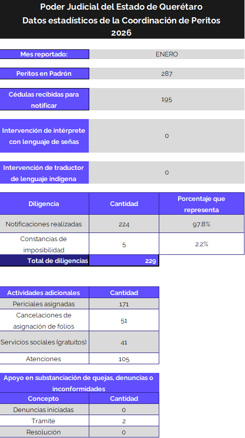 En la Jefatura de peritos, además de las actividades que se han mencionado se llevan a cabo los procesos administrativos con motivo de denuncias presentadas en contra de los integrantes del padrón de peritos, por incumplimiento al reglamento cuando son nombrados como peritos auxiliares de la Administración de Justicia por los Jueces o Magistrados.