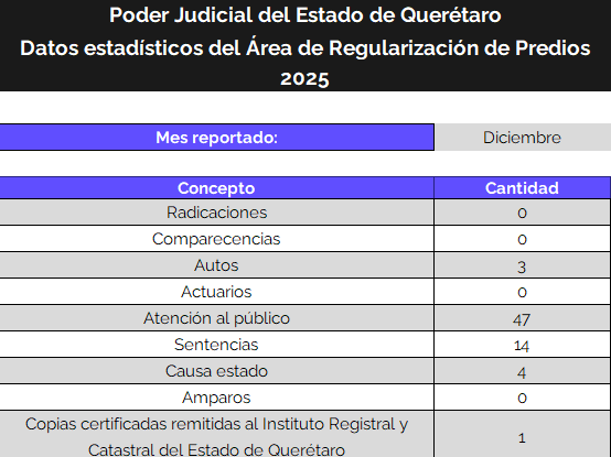 Los procedimientos para regularizar la propiedad de predios rústicos, urbanos y familiares del Estado de Querétaro ante el Poder Judicial, derivan de las solicitudes presentadas exclusivamente y por conducto del Programa para Regularizar y Titular Predios Urbanos, Rústicos y Familiares del Estado de Querétaro, presidido por la Secretaría de Gobierno del Poder Ejecutivo del Estado, a través de la Dirección Jurídica y Consultiva, tienen como finalidad constituirse como un mecanismo jurídico por medio del cual los habitantes del Estado de Querétaro incluyendo sus municipios, podrán obtener cumpliendo con los requisitos legales exigibles, la resolución judicial que ampare la propiedad de sus inmuebles.